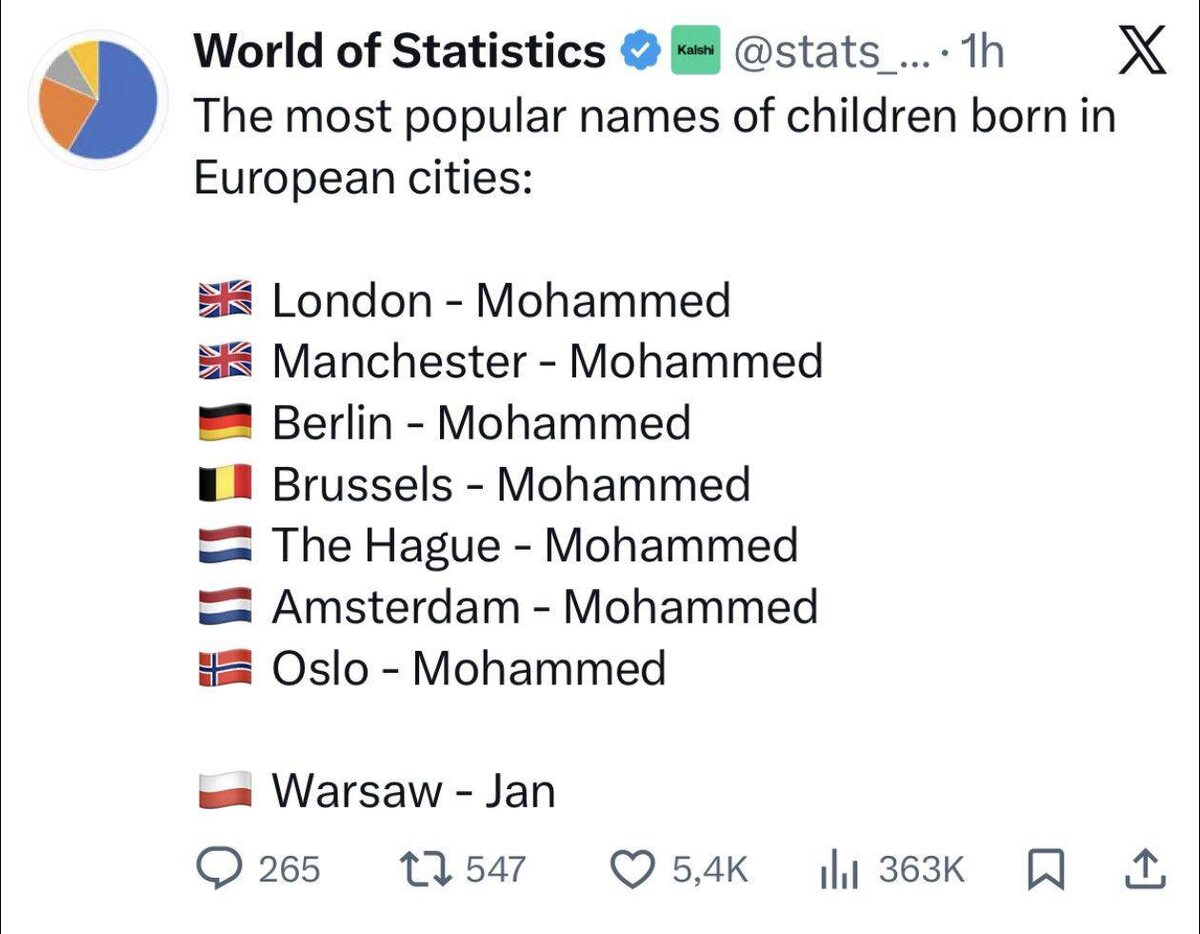 Согласно данным World of Statistics, имя Мухаммед стало самым популярным среди новорожденных в Лондоне, Манчестере, Берлине, Брюсселе