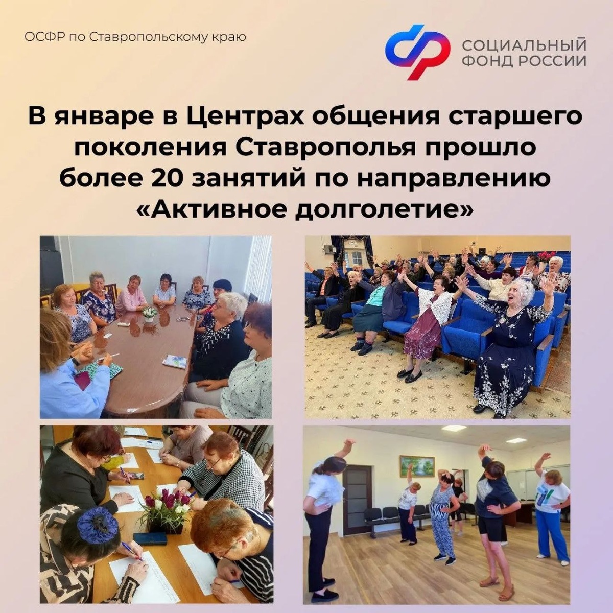 ". Они помогают нашим пенсионерам оставаться бодрыми, здоровыми и полными энергии. ❓Что проходило на занятиях? 🤸🧘Лёгкая гимнастика, йога и дыхательные практики для поддержания формы и внутренней гармонии. Мастер-классы по нейрогимнастике и вокалотерапии. Встречи с врачами: онкологом и кардиологом. Лекции о здоровом питании, профилактике заболеваний. Тренинги памяти с психологом и другие. ❓Почему это важно? ❤️Здоровье и активность — залог долгой и счастливой жизни. А ещё это отличная возможность найти новых друзей и почувствовать поддержку! ❗️Присоединяйтесь! 📝Если вы или ваши близкие хотите стать частью этого проекта, узнавайте расписание занятий в Центрах общения старшего поколения Ставрополья на сайте СФР . В феврале здесь будет много интересного: тренинги, виртуальные экскурсии, творческие мастер-классы, беседы с медиками, практикумы по финграмотности и многое другое. #СФР #ЦОСП