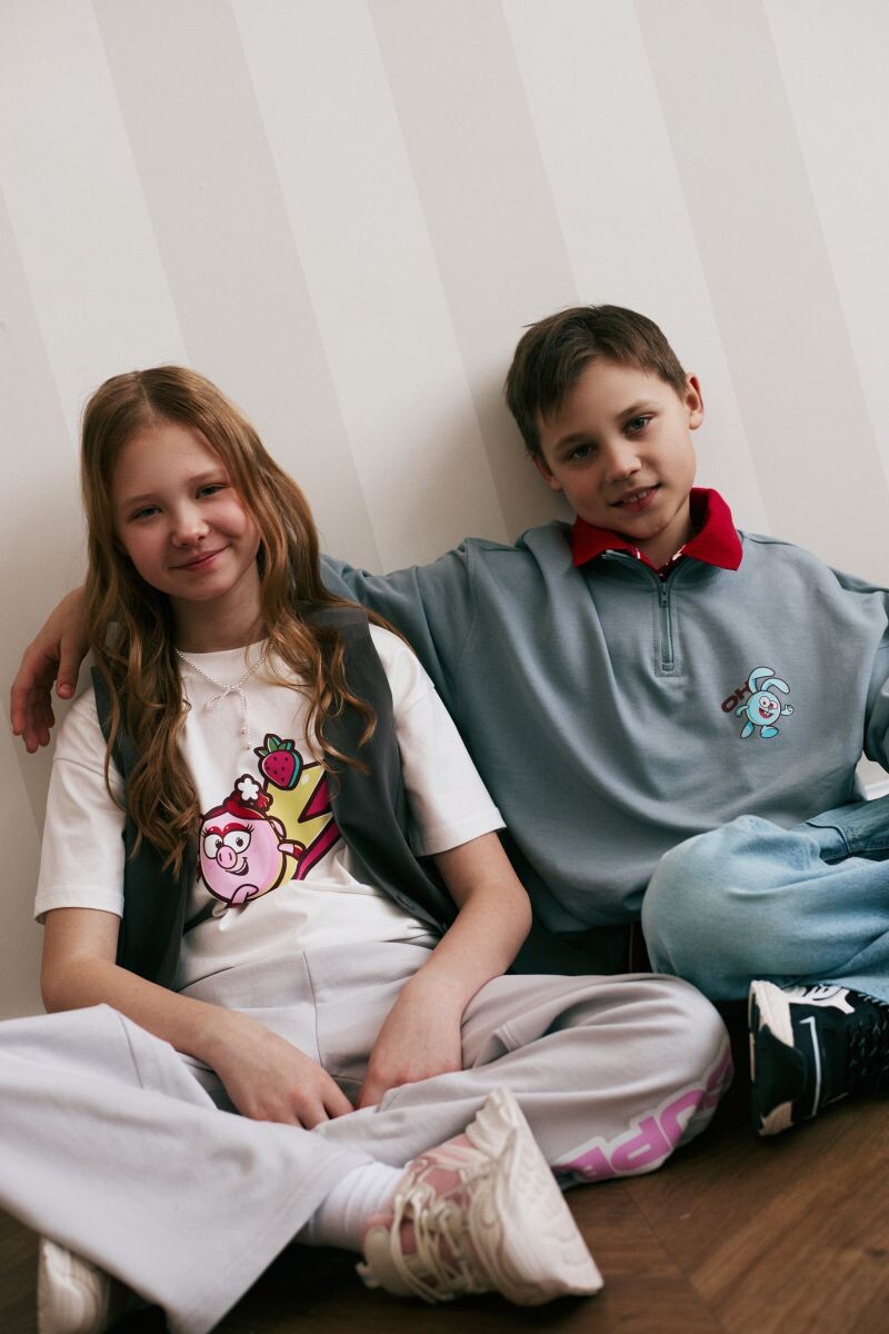 Это не классический лицензионный мерч, а авторская капсула, где герои Ромашковой долины — Крош, Нюша, Ежик, Пин и другие — интегрированы в повседневный гардероб. В ассортименте — хлопковые оверсайз-футболки, лонгсливы, свитшоты, олимпийки, шорты и мягкие джоггеры. Принты дополнены фирменными надписями в духе оригинального мультсериала.