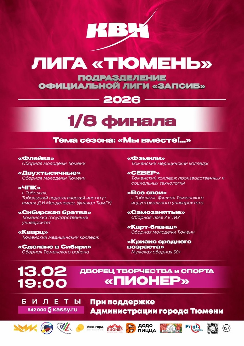 Уже завтра, 13 февраля, в 19.00 в концертном зале Дворца творчества и спорта «Пионер» стартует 35-ый юбилейный сезон Лиги КВН «Тюмень»! Новые и уже полюбившиеся зрителям команды из Тюмени и Тобольска как всегда удивят разнообразием профессий! Мы продолжаем КВН! Приходите и поддержите самых веселых и находчивых!