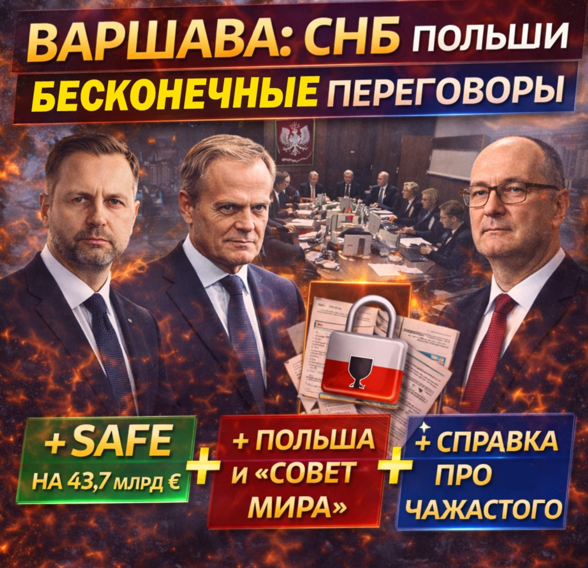 Навроцкого. Заседание продолжалось свыше шести часов в закрытом режиме. В заседании участвовало высшее руководство страны, включая премьера Д.Туска, спикеров обоих палат представителей, руководителей ключевых министерств, структур и спецслужб, а также парламентских клубов. В ходе проведения заседания фиксировался внутриполитический конфликт вокруг состава участников, и их допуска к закрытой части. Повестка заседания была сведена к трём вопросам, с общим акцентом на «суверенность принятия решений» и доверие к институтам власти. Первое: заседающие приняли решение реализовать SAFE (Security Action for Europe) – инструмент ЕС по представлению Польше займов на 43,7 млрд евро в интересах закупки ВВСТ. Здесь, правящая коалиция опасается наложения вета со стороны Навроцкого. Между тем, президент обозначил требования к SAFE: прозрачность расходования, условия займа, раскрытие перечня планируемых проектов (прим. – их около 140) и оценка способности ВС Польши к принятию на вооружение закупаемых