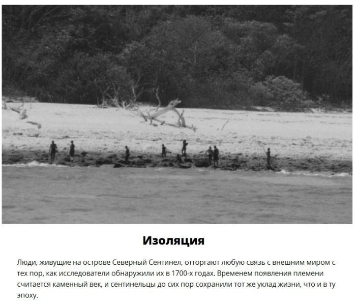 Племя острова Северный Сентинел, которое отказалось от цивилизации и до сих пор живет в каменном веке. На протяжении 60 тысяч лет, их жизнь практически не изменилась, они так же занимаются охотой и собирательством, и так и не научились добывать огонь. Они очень агрессивно относятся ко всем чужеземцам, и если вы прибудете туда, они, скорее всего, постараются вас убить. Терра инкогнита | Неизвестная земля