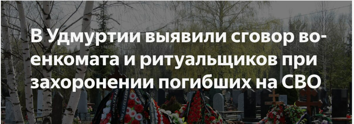 Самая показательная история — семья военнослужащего К., погибшего в зоне СВО. 11 ноября 2024 года мать погибшего пришла в военкомат. Сержант В. вручил ей извещение о смерти сына и, как бы между прочим, добавил: «Можете обратиться в любое ритуальное агентство, а можете вот сюда — „Иж Ритуал“». Визитка, улыбка, формальная оговорка о свободе выбора .