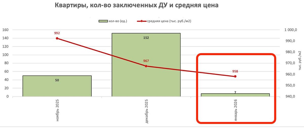 Практически все бесплатные брокеры рассказывают о том, что цена будет расти в Aurus Residences на х2/х3 по причине того, что цены в Жк One выросли на десятки миллионов рублей за эти полгода. Это не более чем фантазия и желание за большую комиссию затащить людей, в том числе из регионов, в проект, который стартовал явно с оверпрайсом. В Доме Дау в начале месяца был объем квартир ниже 800 тыс. м2. Но там очевидные проблемы с продажами. Что на самом деле происходит с продажами в ЖК One? Фактически цены сделок в среднем не превысили 1 млн./м2. В январе было зарегистрировано всего 7 договоров, и средняя стоимость проданного метра составила 958 тыс. рублей. Цены на бумаге выросли у Застройщика Мр, и продажи сильно упали, а в сделках они ниже, чем на старте Aurus Residences. Никто ничего пока не заработал в One. Я не уверен, что и по ценам старта можно точно сейчас перепродать лоты по переуступке, потому что в уступках очень плохо продаются такие объекты. Логика очень простая. Жк One