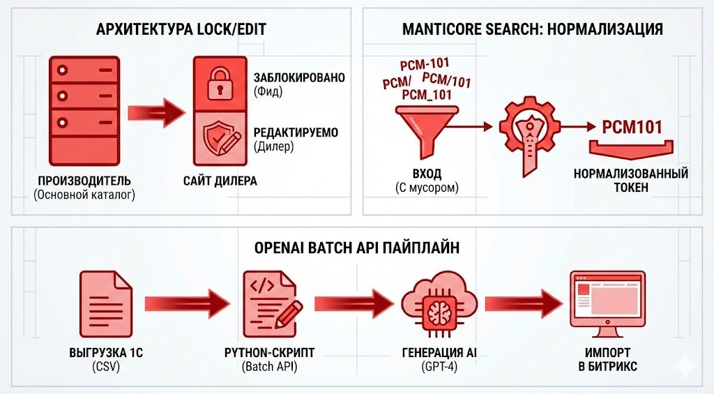 Федеративная архитектура дилерских сайтов: Bitrix, Manticore Search и OpenAI Batch API для каталога на 50k SKU