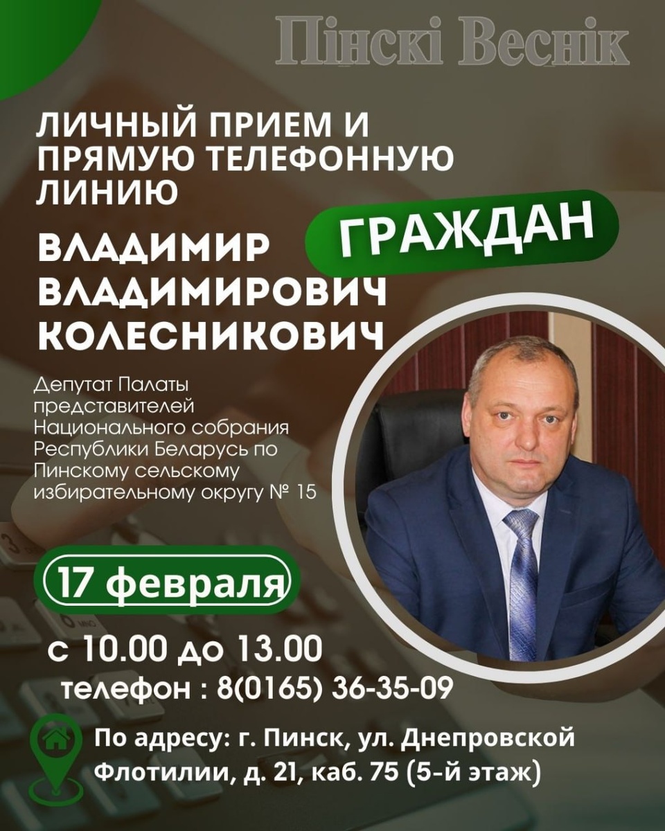 ! Предварительная запись на личный прием будет осуществляться 16 февраля 2026 года с 8.00 до 13.00 по номеру телефона (80165) 36 35 09. ➡️А также выездной прием граждан и представителей юридических лиц в здании Логишинского сельисполкома 18 февраля 2026 года с 10.00 до 11.00 по адресу: г.п. Логишин, ул. Ленина, 104. #прямаятелефоннаялиния #естьвопросы #звоните @Пинский Вестник