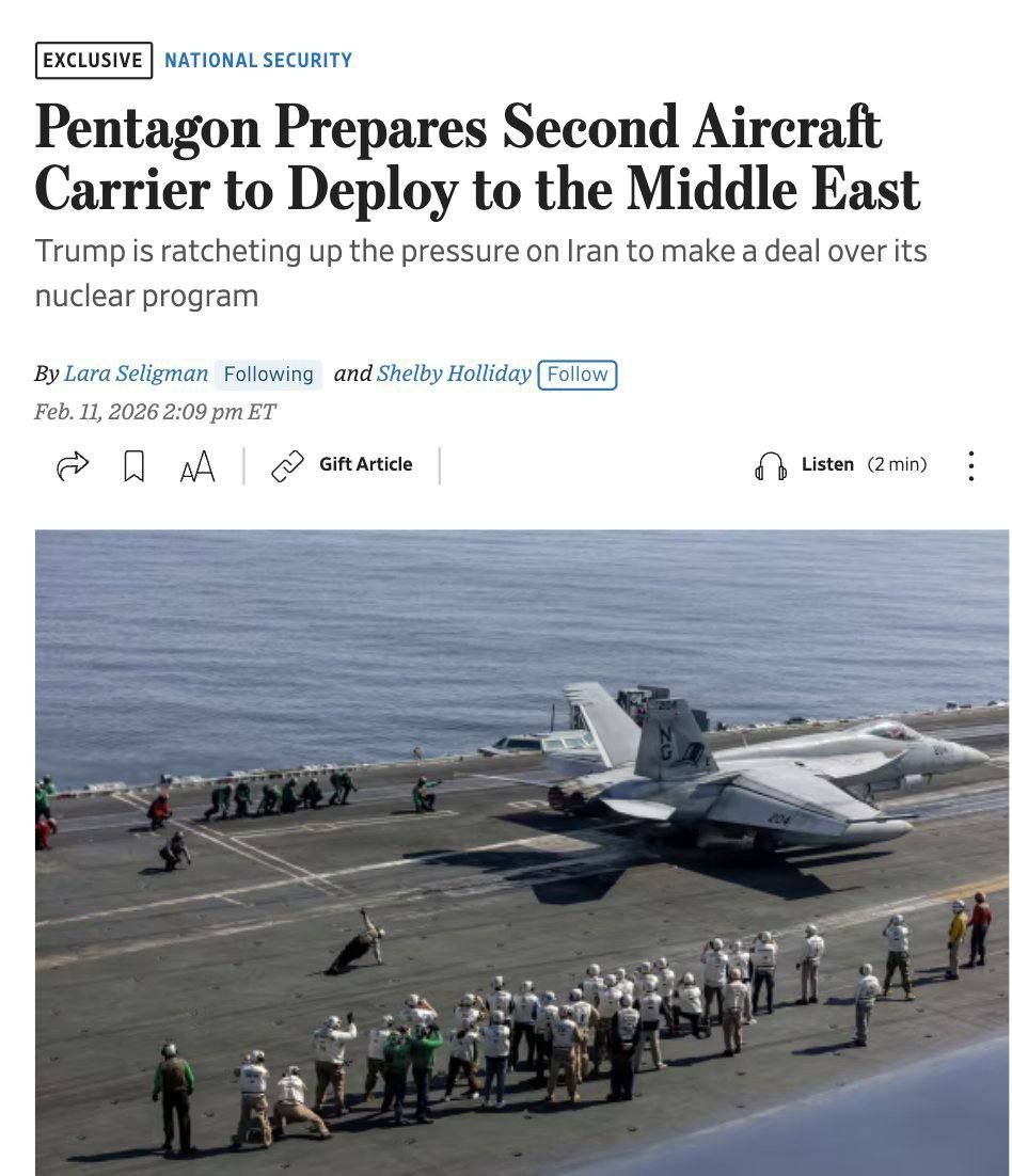 W. Bush, приводится в готовность для возможного развертывания на Ближнем Востоке, сообщает The Wall Street Journal. Как утверждают источники газеты, официального распоряжения о переброске пока не последовало, однако подготовительные мероприятия уже идут: корабль может выйти в район предполагаемой операции в ближайшие две недели. Сейчас «Джордж Буш» задействован в учениях у побережья Вирджинии. Одновременно вблизи Ирана уже находится другая американская АУГ — во главе с авианосцем USS Abraham Lincoln. На этом фоне Дональд Трамп заявил, что добивался продолжения диалога с Ираном, но вновь предупредил Тегеран: если переговоры сорвутся, США готовы повторить сценарий операции «Полуночный Молот». https://dzen.ru/id/6425916a1950720421f18802