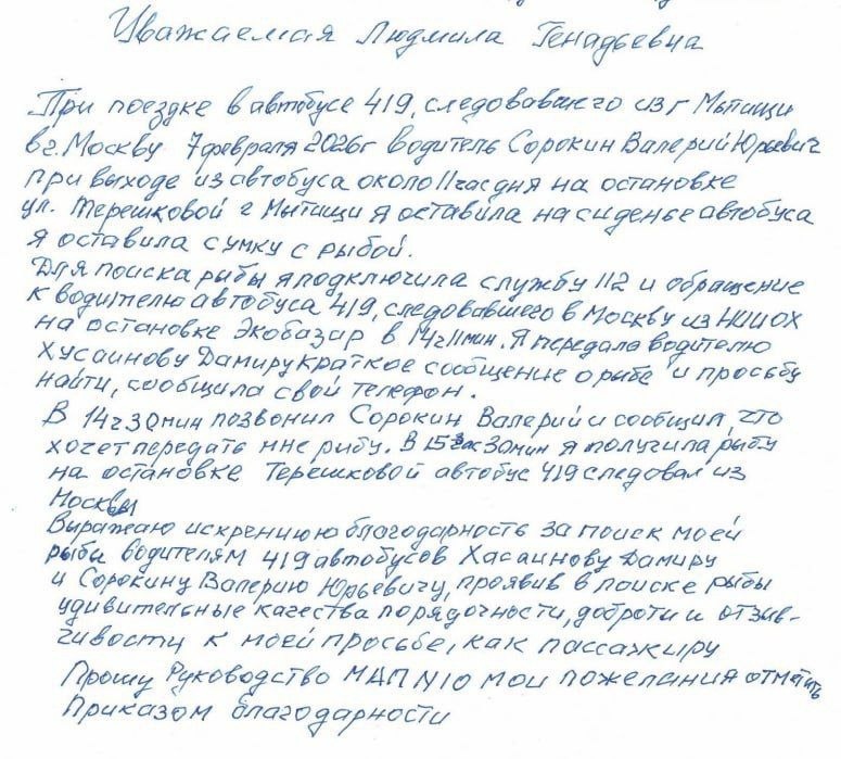 Осознав потерю, она обратилась за помощью к водителю другого автобуса. Благодаря слаженным действиям сотрудников Мострансавто, сумка с рыбой была оперативно найдена и возвращена владелице. Подробности в ее письме, ни одна рыба не пострадала🙏 Водителям Хусаинову Дамиру и Сорокину Валерию большая благодарность‼️