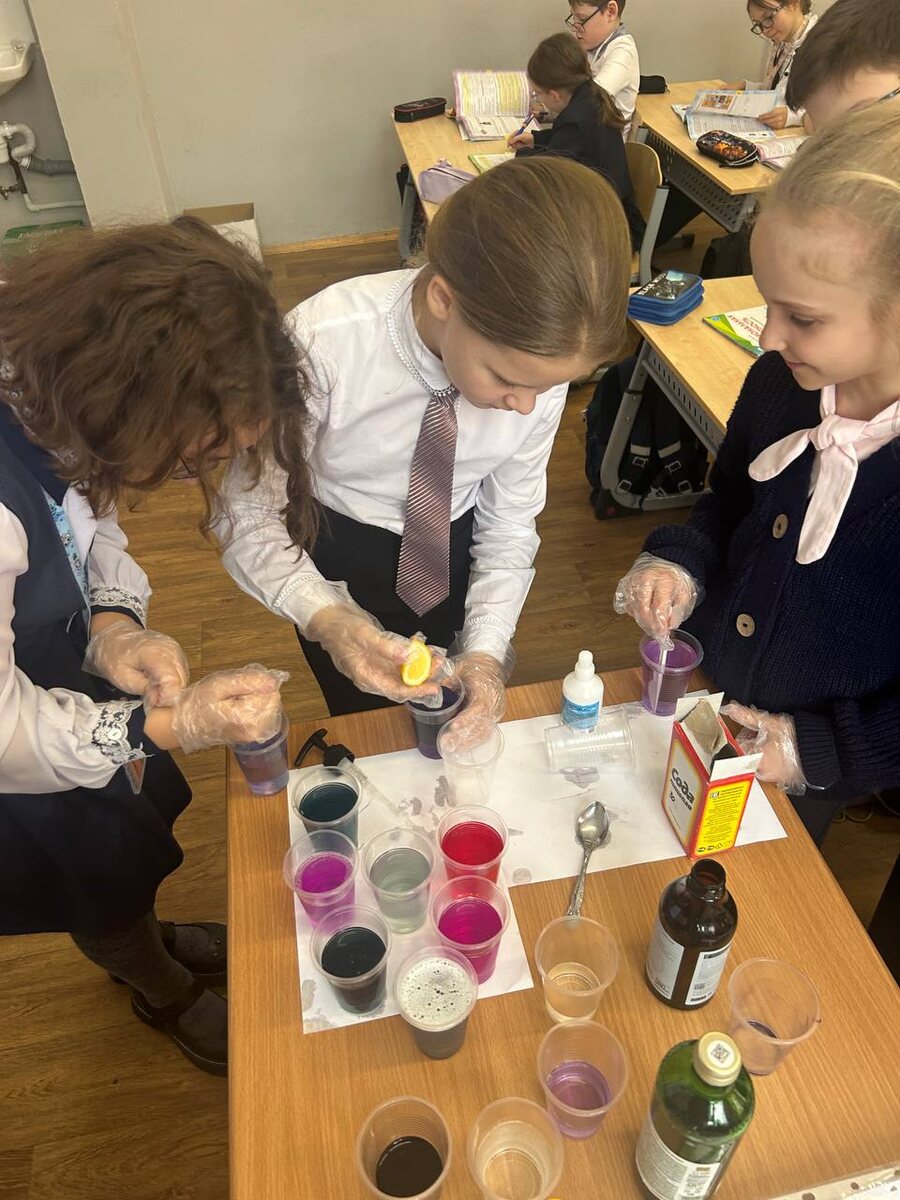 Β»! ΠΠ° ΡΡΠΎΠΊΠ΅ Β«ΠΠΊΡΡΠΆΠ°ΡΡΠΈΠΉ ΠΌΠΈΡΒ» ΡΡΠ΅Π½ΠΈΠΊΠΈ 4 Β«ΠΒ» ΠΊΠ»Π°ΡΡΠ° ΠΏΡΠΎΠ²Π΅Π»ΠΈ ΡΠΊΡΠΏΠ΅ΡΠΈΠΌΠ΅Π½Ρ Β«ΠΠΎΠ·Π½Π°Π½ΠΈΠ΅ ΠΌΠΈΡΠ°Β» Π½Π° ΡΠ΅ΠΌΡ Β«ΠΠ½ΡΠΎΡΠΈΠ°Π½Ρ β ΠΏΡΠΈΡΠΎΠ΄Π½ΡΠ΅ ΠΈΠ½Π΄ΠΈΠΊΠ°ΡΠΎΡΡ ΠΊΠΈΡΠ»ΠΎΡΠ½ΠΎΡΡΠΈΒ». Π Π΅Π±ΡΡΠ° ΡΠ·Π½Π°Π»ΠΈ, ΡΡΠΎ ΠΊΡΠ°ΡΠ½ΠΎΠΊΠΎΡΠ°Π½Π½Π°Ρ ΠΊΠ°ΠΏΡΡΡΠ° ΡΠΎΠ΄Π΅ΡΠΆΠΈΡ Π°Π½ΡΠΎΡΠΈΠ°Π½Ρ β ΠΏΠΈΠ³ΠΌΠ΅Π½ΡΡ, ΠΌΠ΅Π½ΡΡΡΠΈΠ΅ ΡΠ²Π΅Ρ Π² Π·Π°Π²ΠΈΡΠΈΠΌΠΎΡΡΠΈ ΠΎΡ ΠΊΠΈΡΠ»ΠΎΡΠ½ΠΎΡΡΠΈ ΡΡΠ΅Π΄Ρ. Π¨ΠΊΠΎΠ»ΡΠ½ΠΈΠΊΠΈ ΠΏΡΠΈΠ³ΠΎΡΠΎΠ²ΠΈΠ»ΠΈ ΠΎΡΠ²Π°Ρ ΠΈΠ· ΠΊΠ°ΠΏΡΡΡΡ ΠΈ Π΄ΠΎΠ±Π°Π²Π»ΡΠ»ΠΈ Π² Π½Π΅Π³ΠΎ ΡΠ°Π·Π½ΡΠ΅ Π²Π΅ΡΠ΅ΡΡΠ²Π°: ΡΠΎΠ΄Ρ, ΡΠΊΡΡΡ, ΠΌΡΠ»ΠΎ, ΠΏΠ΅ΡΠ΅ΠΊΠΈΡΡ Π²ΠΎΠ΄ΠΎΡΠΎΠ΄Π° ΠΈ Π»ΠΈΠΌΠΎΠ½Π½ΡΡ ΠΊΠΈΡΠ»ΠΎΡΡ. ΠΠ°ΠΆΠ΄ΡΠΉ ΡΠ΅Π°Π³Π΅Π½Ρ ΡΠΎΠ·Π΄Π°Π²Π°Π» Π½ΠΎΠ²ΡΡ ΠΎΠΊΡΠ°ΡΠΊΡ β ΠΏΠΎΠ»ΡΡΠΈΠ»Π°ΡΡ Π½Π°ΡΡΠΎΡΡΠ°Ρ ΠΏΠ°Π»ΠΈΡΡΠ° Ρ