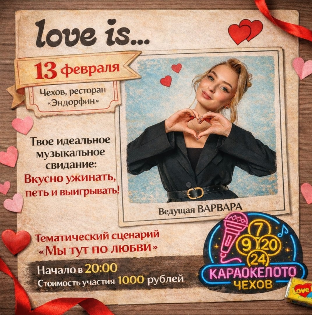 ✨ КараокеЛото Чехов ❤️ 13 февраля — вечер, который легко может стать вашим идеальным свиданием. КараокеЛото с трогательным сценарием «Про любовь» — и это будет громко, весело и очень душевно 🎤✨ Представьте: 🍽 вкусный ужин в ресторане 🎶 любимые песни, которые поёт весь зал 💃 танцы, смех и атмосфера настоящего праздника 🎁 призы и азарт игры Сюда приходят парами, друзьями с близкими — потому что здесь легко знакомиться и чувствовать себя «своим» уже через 10 минут ❤️ Места заканчиваются очень быстро! Бронь 89859489903 Варвара 📆 13.02.2026 🕛 20:00 🏢 Ресторан ЭНДОРФИН 📍 г. Чехов, Симферопольское ш., 2 💰 Цена: 1000 ₽ 🔗 Забронировать: https://vk.ru/karaokeloto_chv ⭐Поддержать канал голосом ✅ Мероприятия Чехов https://dzen.ru/id/66cc4b48e9ef144699238a51 http://vk.com/chekhov_events http://dzen.ru/chekhov_events