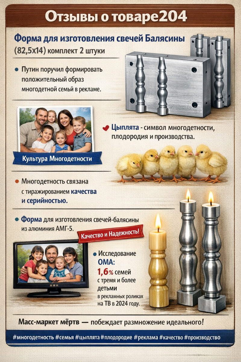 15 января 2026 «Качество алюминия хорошее, хватит на долго. Красивая свеча-балясина получается. Советую». ✅ Проверенный покупатель (заказ № 4117, WhatsApp) художник-промтер, музей Промтов «Меня всё время спрашивают: „Почему у тебя в музее столько цыплят?“ А я теперь отвечаю — это Путин поручил формировать образ многодетной семьи! И „Культура Цикла“ меня услышала. Заказала у них форму для балясины. Теперь у меня не только цыплята в промтах, но и свечи-балясины „рождаются“ пачками. Каждая — как ребёнок. Форма реально плодовитая. Спасибо Маузеру за алюминиевую фертильность!» свечная мастерская «Старый воск» «До этой формы купил на OZON „заготовку за 3000“. Написали: „доработайте сами“. Я не сварщик, я свечник. Дорабатывал напильником, пил, матерился. Пластик поплыл на пятой заливке. Здесь — 29 310 ₽. Дорого? А вы посчитайте: 5000 циклов. 10 лет работы. Ни одной доработки. Вынул из коробки, залил — глянец. Балясина как с картинки. Окупилась за две недели». архитектурный бетон, реставрация