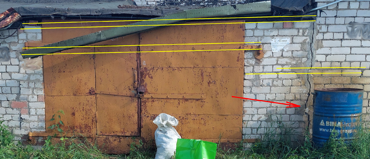 Обратите внимание насколько просела стена справа. Уровень просадки хорошо видно не вооруженным глазом, но для удобства я пометил жёлтыми линиями. Почти 8 сантиметров! А ещё, заметили красивую трещину, отмеченую красной стрелкой? Сейчас расскажу в чём причина.