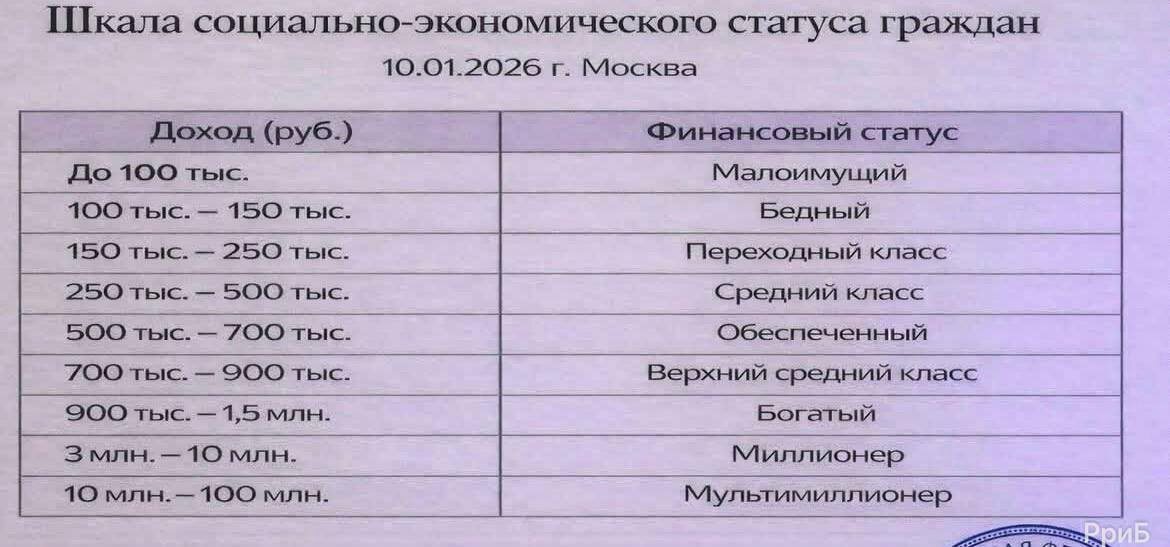 В сети появилась шкала статусов граждан по доходам. По версии авторов, за чертой бедности живут большинство граждан. Теперь вся Россия состоит из бедных и малоимущих 🥲 📲 Читайте нас в MAX 👍 Подписаться на канал | Прислать новость