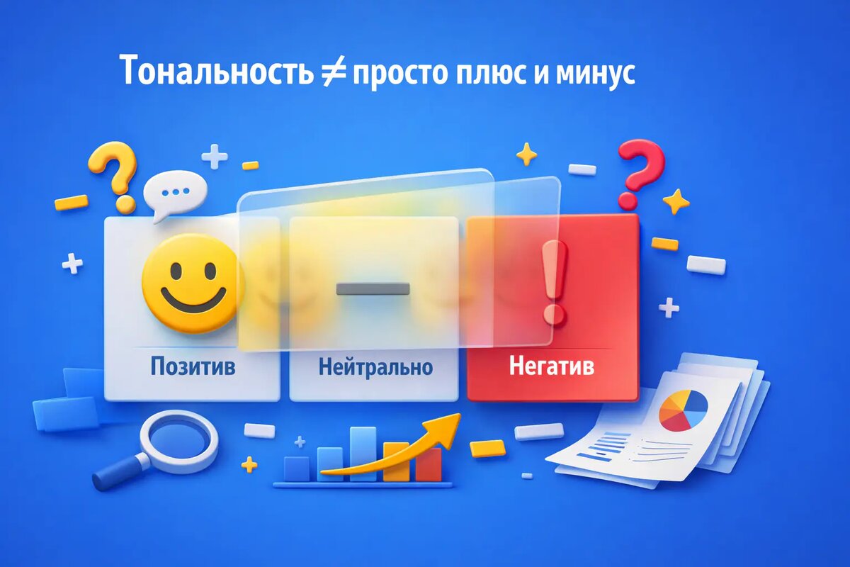Это ошибка. Тональность — это не график в отчёте. Это ответ на вопрос: где риск, где инсайт, а где просто шум. Если анализ не встроен в процесс — он бесполезен. Если встроен — он меняет продукт, PR и клиентский сервис. Разбираем без теории ради теории. Формально всё просто: позитив, негатив, нейтрально. На практике — сложнее. Фраза «доставка заняла два дня» — нейтральна. Но если клиент ожидал срочную доставку — это уже скрытый негатив. Тональность без контекста — половина картины. Важно понимать: Считать эмоции — мало. Нужно понимать последствия. Типовой сценарий: Компания видит всплеск негатива → отвечает на каждый комментарий → успокаивается. Но не проверяет: В итоге реакция есть, изменений — нет. Метрика без действия — просто число. Сообщение может быть одновременно разным по отношению к разным объектам. «Продукт хороший, но поддержка не отвечает» — позитив к продукту, негатив к сервису. Если система не разделяет объекты — компания начинает защищать бренд там, где нужно исправлять