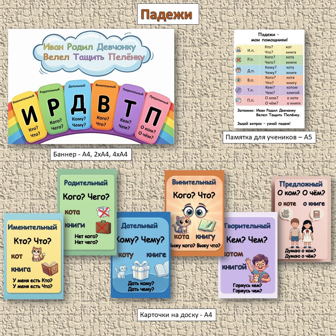 Комплект наглядных материалов по русскому языку для учащихся 3-4 классов по теме «Падежи имён существительных»: - 6 ярких карточек-памяток — по одной на каждый падеж (Именительный, Родительный, Дательный, Винительный, Творительный, Предложный). - Баннер для оформления доски или стенда — обобщает всю тему в одном удобном формате. - Цветовая кодировка и запоминающиеся иконки-ассоциации (подарок, глаза, ручка и др.) помогают детям легко ориентироваться в падежах. Форматы: - Баннер - А4, 2хА4, 4хА4 - Памятка для учеников (А5, 2 на листе А4 — удобно вырезать и вклеивать в тетрадь) - 6 ярких карточек-памяток — по одной на каждый падеж на листах А4 Идеально для: - оформления уголка русского языка в классе, - индивидуальных памяток в тетрадь, - работы в парах и группах, - домашнего повторения. Цена комплекта 500 руб. Приобрести можноо по ссылке https://payform.ru/3naEb5M/. На маркетплейсе Инфоурок https://infourok.ru/magazin-materialov/padezhi-1391915