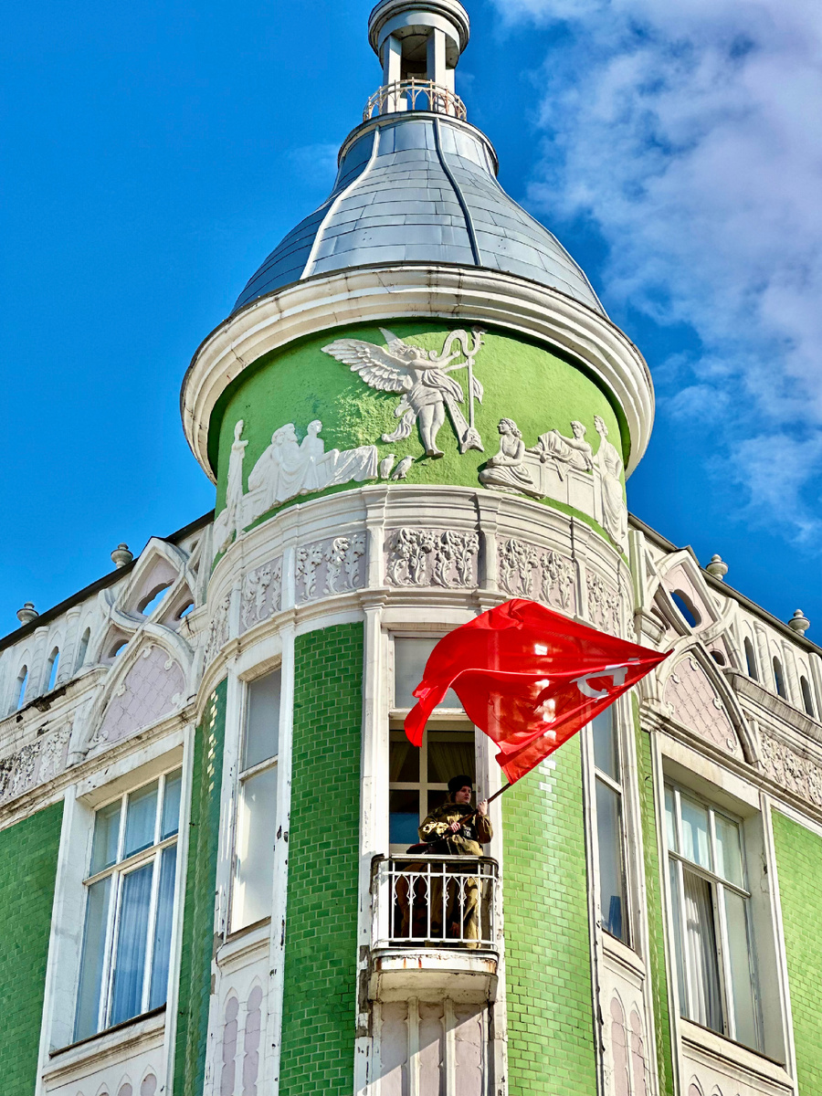 Я, к сожалению, как и вы, многое смотрю лишь на фото, так как приехала к музею имени Фелицына аккурат в 12.00 (то есть к самому началу), поэтому у заграждения выстроилось уже несколько рядов людей, каждый выше меня ростом минимум на голову. Поэтому фотографировала и снимала с высоко поднятой руки, уперевшись глазами в спины. Но зато, когда состоялся конец кульминации и на роскошный балкон бывшей гостиницы «Централь» под песню «День победы» вынесли флаг, оказалась в самом удачном месте.