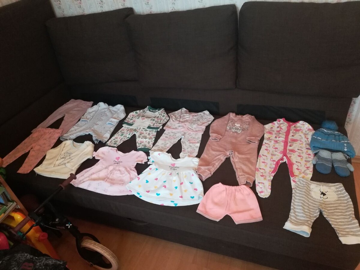 Отдам детские вещи на девочку от 3мес до 2-х лет. Два тёплых комбинезона размер 62 и 68,подойдут как мальчику, так и девочке. Теплые сапоги 27размер.