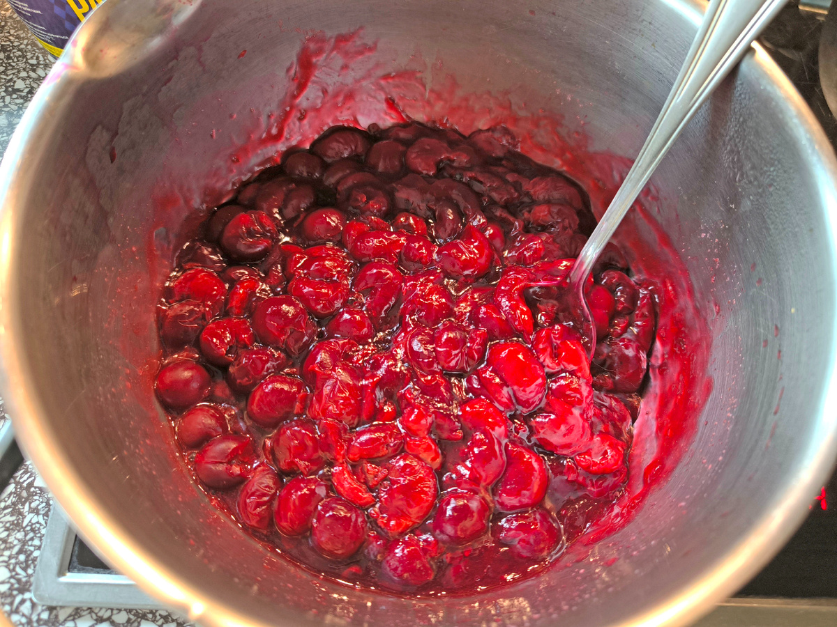 Здравствуйте, дорогие мои! ✨ Признаюсь честно: я просто без ума от творожной выпечки - она такая нежная, уютная и всегда поднимает настроение. Сегодня спешу поделиться с вами рецептом потрясающей творожной запеканки с замороженной вишней. Кстати, вишня тут лишь идея: смело берите любую ягоду из морозилки, которая попадётся под руку, будет не менее вкусно! Для выпечки я взяла керамическую форму размером 20×25 см., в ней запеканка очень красиво выглядит, но подойдёт любая форма Начнём с ягодной начинки. Я взяла 300–350 г вишни без косточек и высыпала её в ковшик. Поставила на средний огонь, как только ягоды начали таять, из них выделился ароматный сок! Его я аккуратно слила в отдельную мисочку, добавила полную, с горкой, столовую ложку кукурузного крахмала и хорошенько размешала. Когда вишня прогрелась и закипела, добавила подсластитель и влила разведённый крахмал. Как только масса загустела - сразу выключила. Готово! Начинка получилась сочная, с лёгкой кислинкой - просто объедение. Теп