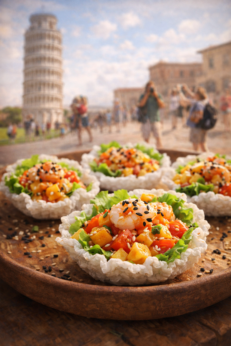 Эта оригинальная закуска превратит любую вечеринку в настоящую кулинарную экскурсию! Захватите билеты, запаситесь хорошим настроением и давайте путешествовать вместе! · Рисовая бумага — хрупкие листы-путешественницы · Крабовые палочки — ½ упаковки (маленькие морепродукты-помощники) · Креветки — 10 крупных особей (мини-шримпы, чтобы впечатлить) · Свежий огурчик — 1 штука (летняя свежесть в каждом кусочке) · Творожный сыр — 1 столовая ложка (мягкость и утонченность) · Кунжутный соус — 2–3 чайные ложки (плюс бонусное кунжутное облако над закуской) · Салатные листья — лайнеры зеленого моря (пусть каждый кусочек лежит на зеленом коврике) · Черный кунжут — для декора и дополнительной крутости 1. Фокус-покус с рисовой бумагой: нагреваем большое количество масла на максимуме и быстренько погружаем рисовую бумагу, превращая её в хрустящие лепестки счастья. 2. Создание начинки: мелко рубим крабовые палочки, креветки и огурчик. Объединяем всё с творожным сыром и кунжутным соусом. Эта начинка стан