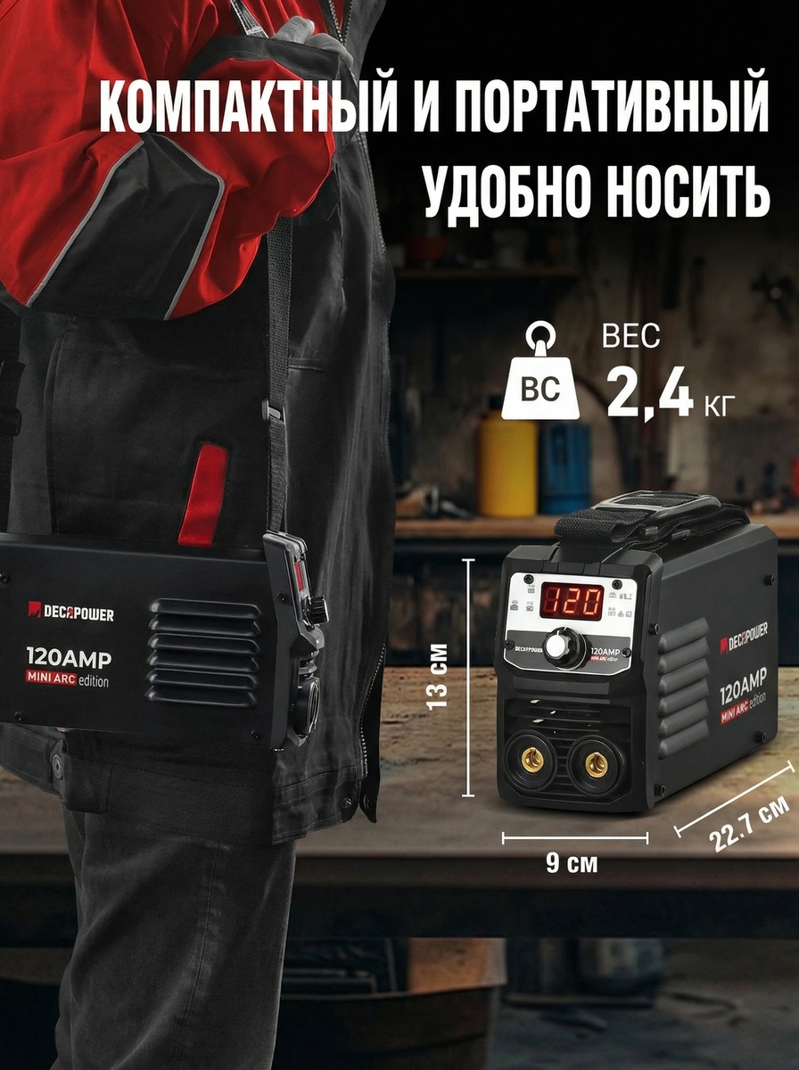 Сварочные инверторы «малого формата» выбирают не за максимальные амперы, а за удобство: чтобы аппарат легко хранился, быстро перевозился и запускался без лишней подготовки. DECAPOWER MINIARC 120 построен вокруг этой идеи: компактный корпус и формат хранения/перевозки в кейсе, когда всё лежит вместе и не теряется.