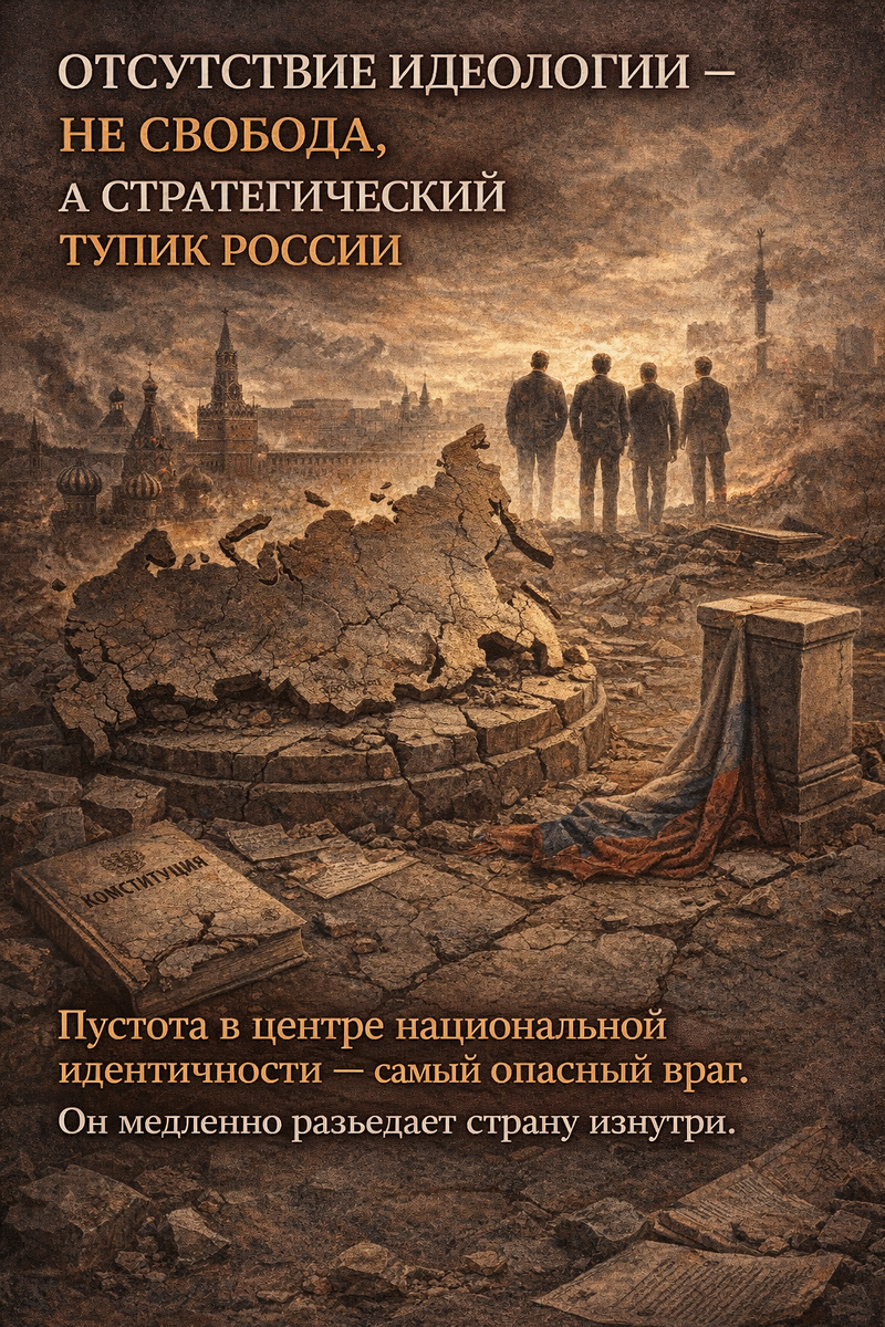 Фактически — во имя пустоты. Этот отказ давно перестал быть гарантией плюрализма. Он стал главным стратегическим провалом, который лишил страну будущего. Потому что отсутствие идеологии — это не нейтралитет. Это вакуум. А вакуум, как известно, всегда чем-то заполняется. Обычно — страхом, мифами и краткосрочной выгодой. У нас до сих пор путают идеологию с пропагандой. Пропаганда объясняет, почему сегодня плохо и кто в этом виноват. Идеология отвечает на другой вопрос: ради чего всё это и что будет завтра. СССР, при всех своих трагических ошибках, имел чёткую сверхцель — построение нового общества. Утопию, но цель. Она задавала векторы развития: образование, наука, индустриализация, космос. Страна знала, куда она идёт, даже если шла туда неправильно. Современная Россия живёт прошлым.