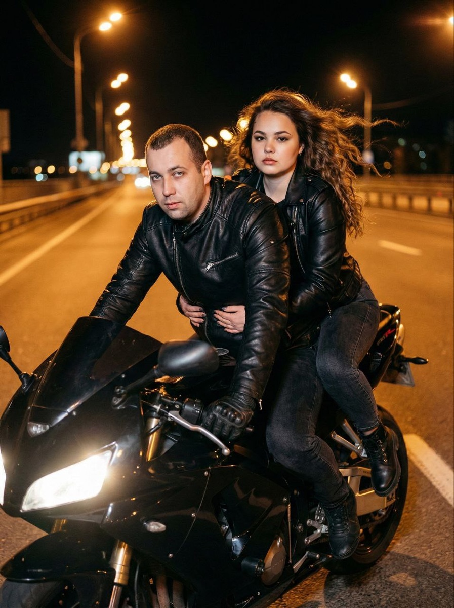 😀Выбираем "нейросети" 😀Нажимаем "Nano Banana" 😀Нажимаем "Nano Banana Pro" 😀Прикрепляем через скрепку свое фото и выбранный промпт 😀Наслаждаемся результатом😍 Создай фото не меняя черты лица и цвет волос. "Photoreal, cinematic night motorcycle portrait: пара на чёрном спортивном мотоцикле по освещённой городской магистрали, яркая фара, длинная развевающаяся шевелюра пассажирки, чёрные кожаные куртки, тёплая кинематографичная тональность, shallow DOF, motion‑blur на фоне уличных огней, high‑detail." Короткие детали: ⦁ Одежда: чёрные байкерские кожаные куртки, тёмные джинсы/кожаные брюки, чёрные байкерские перчатки и ботинки; фактура кожи видна. ⦁ Прическа: у пассажирки — длинные волнистые волосы, развеваются ветром, объём у корней. Макияж профессиональный безупречный. ⦁ Мотоцикл: современный чёрный спорт‑байк с яркой фронтальной фарой и небольшим ветровым стеклом; металлические элементы с лёгкими отражениями. ⦁ Поза: водитель слегка наклонён вперёд за рулём, пассажирка плотно держ
