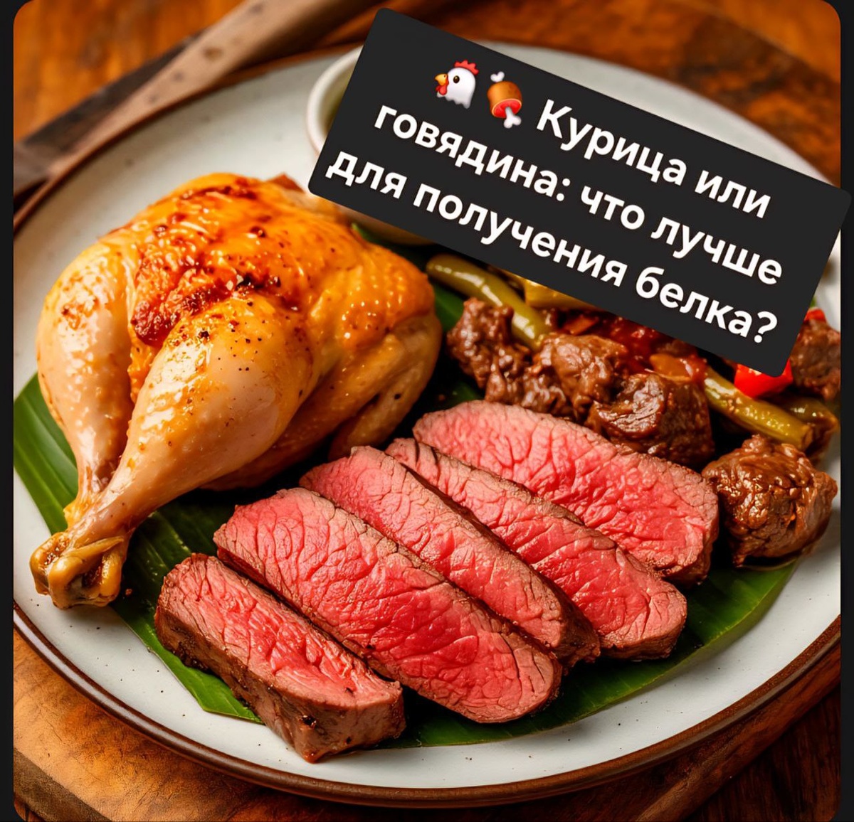 ? И курица, и говядина — отличные источники полноценного белка, но имеют свои особенности. Давайте разбираться! 🍗 Куриная грудка: - В 100 г содержится примерно 32 г белка — это очень много! - Минимум жира и калорий, что делает её идеальной для тех, кто хочет похудеть или сохранить стройность. - Белок из курицы усваивается быстрее и легче, что важно для восстановления после тренировок. - Отличный выбор для тех, кто предпочитает низкокалорийное, но насыщенное белком питание. 🥩 Говядина: - Содержит 19–30 г белка на 100 г — количество варьируется в зависимости от жирности. - Богата железом, которое обеспечивает здоровье крови и помогает бороться с усталостью. - Высокое содержание витамина B12 и цинка — незаменимых элементов для иммунитета и общего тонуса организма. - Идеальна для тех, кто хочет набрать мышечную массу или восполнить дефицит важных микроэлементов. 🥣 Усвояемость: Куриный белок легче и быстрее усваивается организмом, что полезно для быстрого восстановления. Говядина же