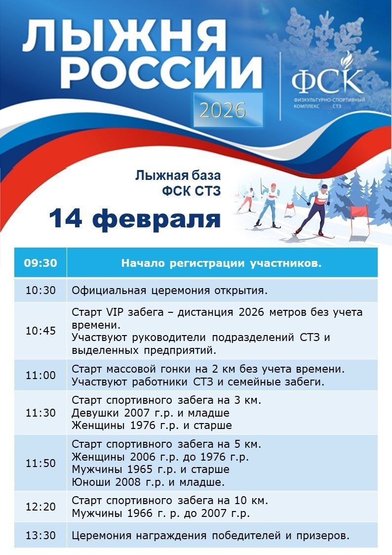 » Уже в эту субботу, 14 февраля, состоятся забеги в рамках XLIV Всероссийских соревнований «Лыжня России». Принять участие в главном лыжном старте страны можно будет в обеих частях города. В южной части на лыжной базе ЦФСМ, по адресу: ул. Дальняя, 30 регистрация будет идти с 9:00, первый старт запланирован на 10:00. В северной части на лыжной базе ФСК СТЗ, по адресу: ул. Павлика Морозова, 34, в 9:30 начало регистрации, в 10:30 пройдёт церемония открытия и на 10:45 запланирован первый старт. Читайте нас в Мах