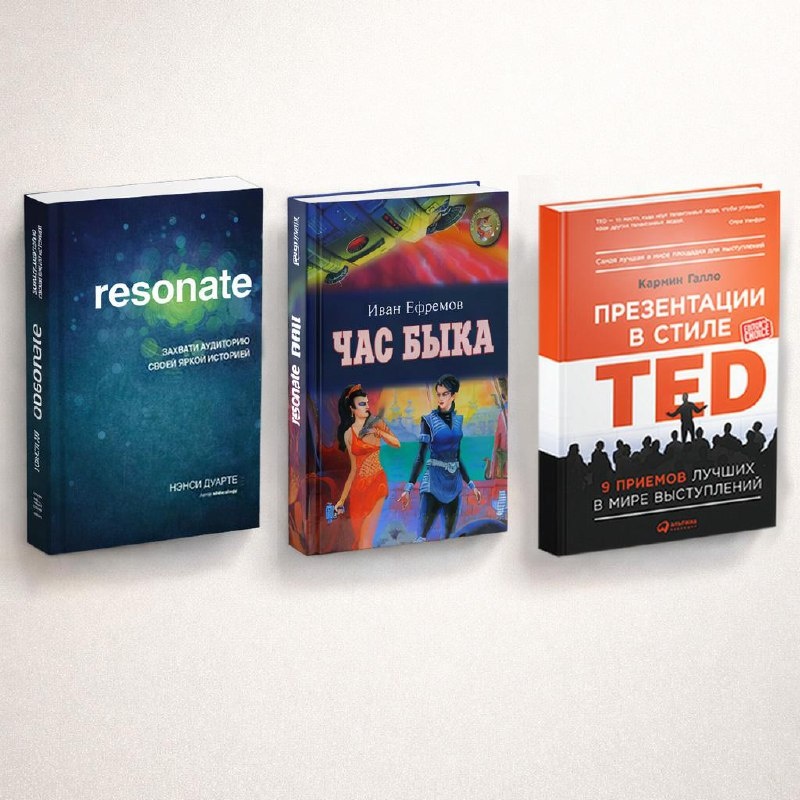 1) Нэнси Дуарте «Resonate / Резонанс» Книга для тех, кто ведёт соцсети. Главная мысль, которую отстаивает автор: герой твоего контента не ты. Герой - зритель. Я читал и обдумывал эту книгу несколько месяцев подряд. Горячо рекомендую всем коллегам. 2) Иван Ефремов «Час Быка» Это антиутопия, которая читается как описание современного мира. По сюжету люди из далёкого будущего прилетают на планету Торманс с гуманитарной миссией и находят общество потомков землян, выстроивших закрытую тоталитарную систему. Меня зацепил не только анализ политики, построенной на диктатуре и власти в руках олигархии, но и то, как Ефремов показывает устройство общества. 3) Кармин Галло «Презентации в стиле TED» Читать дальше