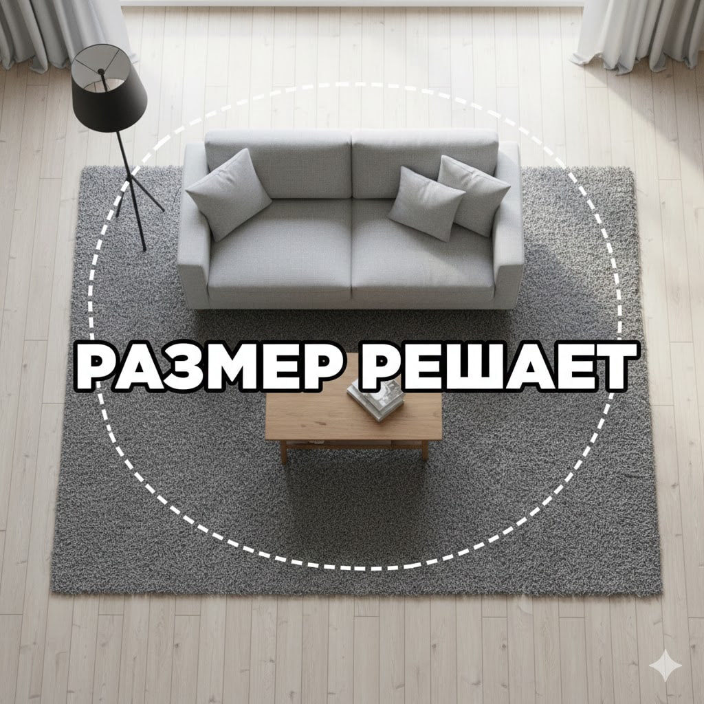 Ковер это не просто «чтобы ногам было тепло». Это фундамент вашей мебельной группы в гостиной Как не облажаться с выбором: Размер имеет значение. Самая частая ошибка-слишком маленький коврик «островок», который скромно лежит перед диваном Правило: Ковер должен быть таким большим, чтобы передние ножки дивана и кресел стояли на нем. Это объединяет мебель в одну зону Геометрия против узоров. Если у вас однотонные стены и диван—берите ковер с геометрическим принтом или абстракцией. Если в комнате и так много деталей—ваш выбор однотонный ковер с выраженной текстурой(высокий ворс или циновка) Забудьте про симметрию.Иногда ковер, положенный немного наискосок или со смещением, выглядит гораздо живее и современнее Материал: -Синтетика(полипропилен): Дешево, легко мыть, не вызывает аллергии. Идеально, если есть дети и собаки. -Шерсть: Дорого, тепло, но может «лезть» и впитывать запахи. -Вискоза: Красиво блестит (похожа на шелк), но боится даже капли воды — сразу остается пятно.