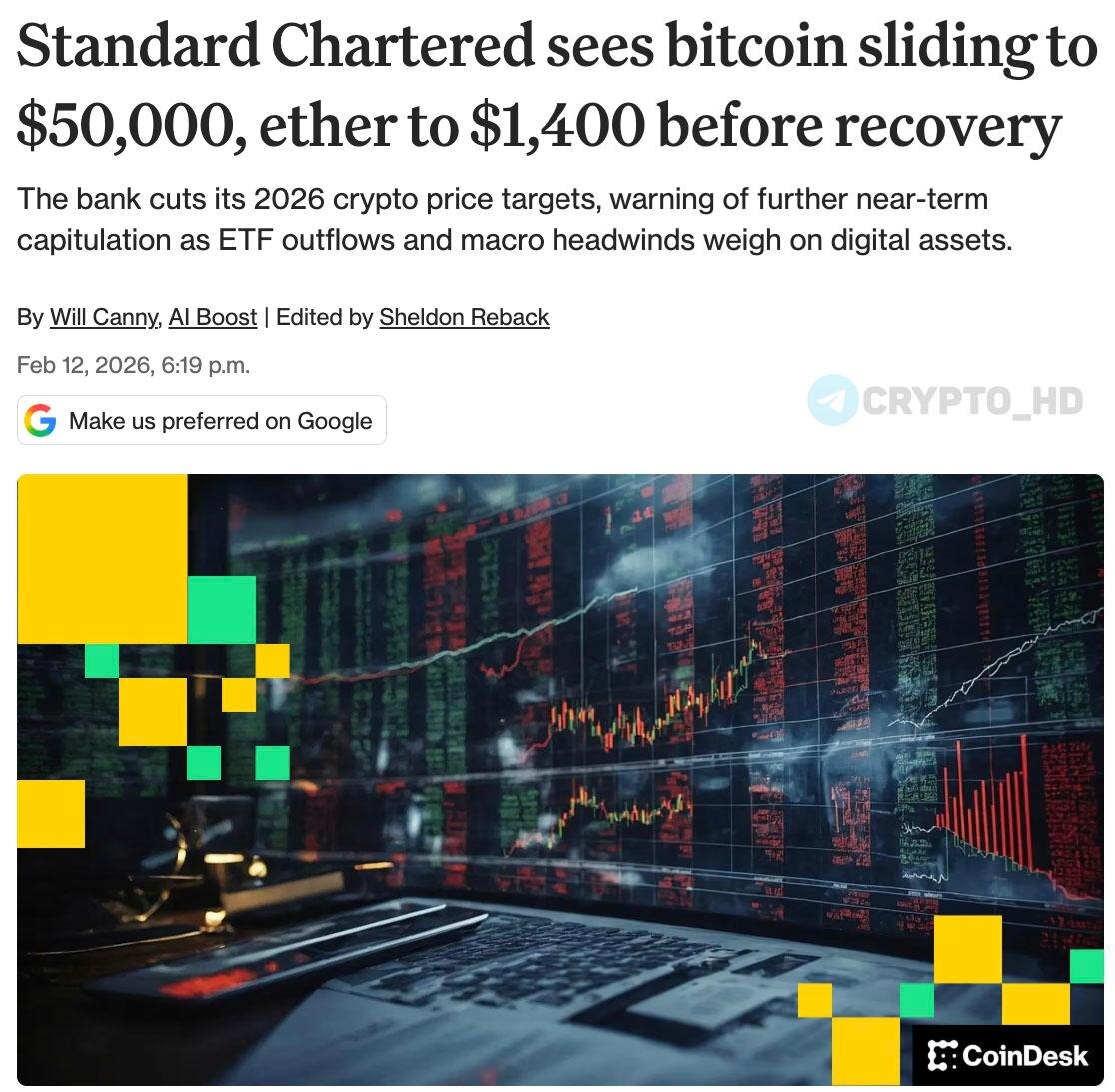 Аналитики Standard Chartered снова скорректировали свои ценовые прогнозы. Краткосрочные ожидания: ▪#BTC может снизиться до $50,000. ▪#ETH – до $1400. Целевые показатели на конец 2026 года (изменения): ▪#BTC: $150,000 → $100,000. ▪#ETH: $7500 → $4000. ▪#SOL: $250 → $135. ➠ Отток из Bitcoin ETF составил почти 100,000 BTC с пика октября 2025 года. ➠ Средняя цена покупки ETF-инвесторов – около $90,000, что означает убыток ~25% на текущих уровнях. ➠ Инвесторы с убытками склонны фиксировать потери, а не «покупать на просадке». ➠ Ожидаемое дно может сформироваться в ближайшие месяцы, после чего прогнозируется восстановление рынка до конца года. ➠Позитив: В отличие от 2022 года, нет коллапса крупных платформ (Terra/Luna, FTX) – рынок взрослеет и становится устойчивее. ➠Долгосрочные прогнозы (2030) остаются без изменений: BTC за $500,000 и ETH за $40,000. Ранее: отказ от бычьего прогноза Crypto Headlines