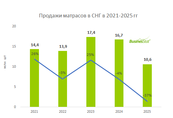 В 2024-2025 гг продажи матрасов в странах СНГ сократились на 39% по отношению к 2023 г и в 2025 г составили 10,6 млн шт.