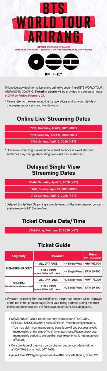 Информация по онлайн-трансляции концертов BTS «WORLD TOUR “ARIRANG”» в Кояне Подробности о продаже билетов будут опубликованы отдельным уведомлением в 08:00 в пятницу, 27 февраля по мск Даты онлайн-прямых трансляций: • 9 апреля 2026 (четверг), 13:00 по мск • 11 апреля 2026 (суббота), 13:00 по мск • 12 апреля 2026 (воскресенье), 13:00 по мск Онлайн-трансляция ведётся в режиме реального времени; точное время начала и окончания может измениться в зависимости от ситуации на площадке. Даты отложенной трансляции (Single-View): • 18 апреля 2026 (суббота), 04:00 по мск • 19 апреля 2026 (воскресенье), 05:00 по мск • 19 апреля 2026 (воскресенье), 13:00 по мск Отложенная трансляция (Delayed Single-View) — это повтор концерта, ранее показанного в прямом эфире. Доступна только в формате HD Single-View. Дата и время начала продаж: 27 февраля 2026 (пятница), 08:00 по мск #weverse @💥BANG!BANGTAN