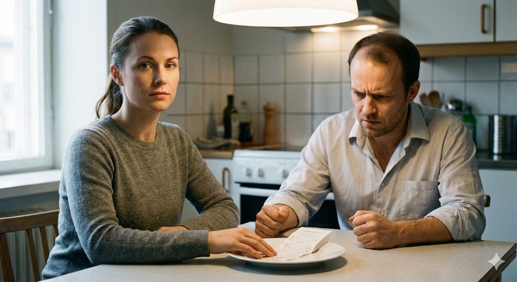 Виталий сидел неподвижно. Вилка лежала на тарелке. Рука — на столе, пальцы — на чеке.