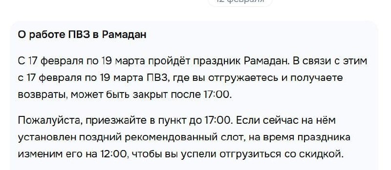 В ЛК селлеров появилось уведомление о работе ПВЗ в период Рамадана: возможное закрытие после 17:00 и перенос рекомендованных слотов. С одной стороны — это просто операционная информация. Если меняется график, селлеру нужно знать. С другой — Россия светское государство. У нас десятки религий и конфессий. Тогда логичный вопрос: увидим ли мы дальше уведомления о графике в Рождество, Пасху, Песах, Курбан-байрам и других религиозных праздниках? Если маркетплейс начинает учитывать религиозный календарь в логистике — важно, чтобы это было системно и одинаково для всех. Marketplace_biz - отдай свой буст каналу