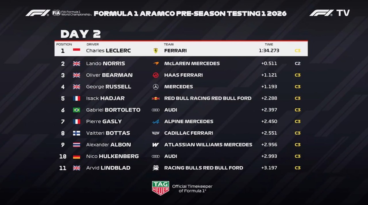 : Лучшее время у Леклера - 1:34.273 Максимум кругов у Норриса - 149. Шарль и Ландо сегодня провели последний день за рулем в рамках этих тестов. По командам: McLaren - 149 Ferrari - 139 (У них все идет по плану, начиная с Барселоны. Технических проблем нет, накатывают километраж, управляемость без полноценной трансляции оценить сложно) VCARB - 133 Williams - 131 (С их стороны пока всё тихо, особых проблем не замечено) Haas - 130 (Окон очень хвалит движок Феррари) Audi - 114 Cadillac - 109 (Сегодня им слегка помешали проблемы с ПО, но ничего критического) Aston Martin - 98 (Километраж сегодня есть, но радости от пилотов никакой не исходит, управляемость болидом пока тоже не наблюдается) Alpine - 97 (Хоть и смогли наездить не мало кругов, но дважды останавливались на трассе из-за мотора) Red Bull - 87 (Всё утро ушло на то, чтобы исправить проблему с гидравликой) Mercedes - 57 (Кими смог с утра проехать только 3 круга, после чего команда решила заменить мотор)