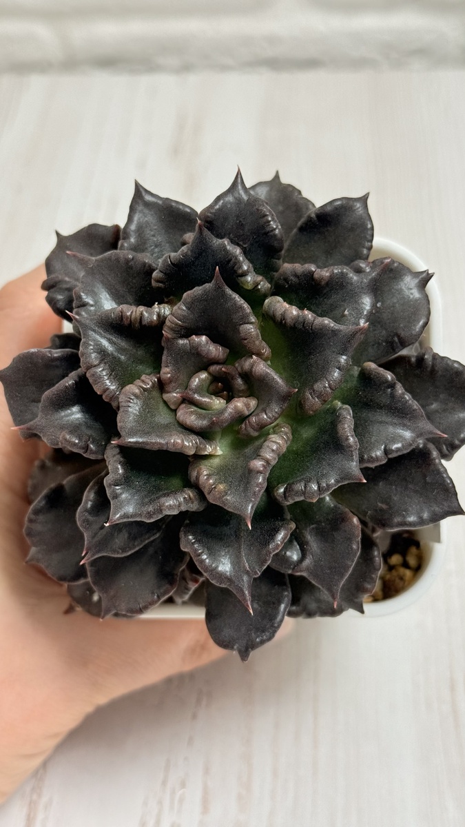 Вокруг этого растения до сих пор ходят легенды. Самая популярная версия гласит, что ‘Super Bowl’ — это спонтанная мутация (монстрозная форма) сорта Echeveria ‘Black Prince’. Якобы где-то в корейских питомниках около 2022 года «Блэк Принц» решил удивить мир и выдал необычного потомка с волнистыми, бугорчатыми листьями.