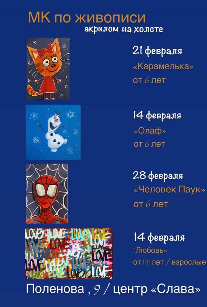 Мастер-классы живописи акрилом на холсте. Сможет каждый. Ваши дети и вы разгрузите психику и переключитесь от будней. Получите удовольствие. Нарисуете сами картину для себя или в подарок. Всё включено. • 7 мест на каждый МК «Олаф» 14 февраля в 11:00 «Любовь» 14 февраля в 16:00 «Карамелька» 21 февраля в 11:00 «Человек Паук» 28 февраля в 11:00 🔸 Записаться: @slavatsenter1 📳 8933 0968987 (тел/ТГ) ул. Поленова д.9 р-н Заовражье Мы рядом! 👍 Подписаться | Ваша реклама