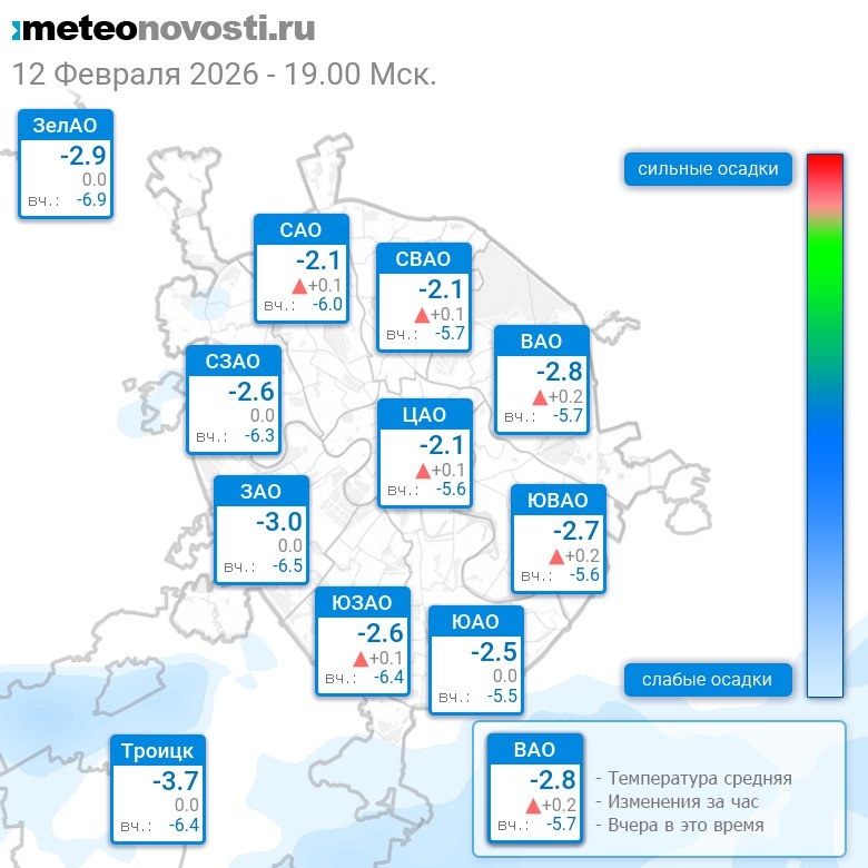 В 19:00 в Москве было от -3.7°C до -1.8°C, средняя температура -2.6°C #погода #Москва #зима #температура #12февраля #четверг
