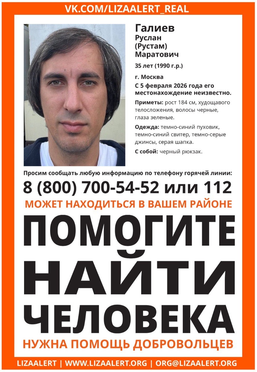 Ориентировка на розыск Руслана (Рустама) Галиева была размещена на сайте волонтерского поискового отряда «Лиза Алерт» во вторник, 10 февраля. В ней указано, что местонахождение мужчины неизвестно с 5 февраля. После появления ориентировки с редакцией Инфопортала связался мужчина, представившийся родственником пропавшего. Он сообщил, что в последний раз Галиева видели на станции Крюково в Зеленограде. Приметы пропавшего: рост 184 см, худощавое телосложение, черные волосы, зеленые глаза. Мужчина был одет в темно-синий пуховик, темно-синий свитер, темно-серые джинсы и серую шапку и имел с собой черный рюкзак. Всех, кому что-либо известно о местонахождении Руслана Галиева, просят сообщить об этом по телефонам +7-800-700-54-52 или 112. 🔵 Прислать новость Инфопортал Зеленограда в соцсетях ⬇️ 🔵 Telegram 📲 MAX 🌐 VK