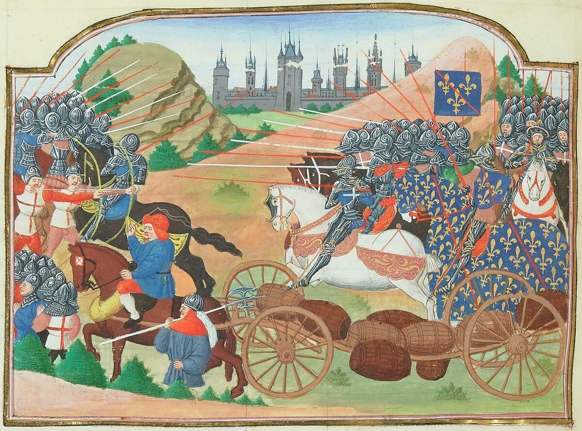 Битва селёдок 🐠 Чувствуете запах? Это не кулинарный блог, это Столетняя война. В начале февраля англичане отправили из Парижа к осаждённому Орлеану обоз примерно из 300 повозок. Внутри не только стрелы, порох и прочие аргументы эпохи, но и бочки с копчёной сельдью. Великий пост на носу, армия должна поститься дисциплинированно и сытно. Рыба тогда была стратегическим ресурсом, почти как нефть, только пахнет сильнее. Французы узнали о движении конвоя. Шарль де Бурбон, граф де Клермон, решил сыграть красиво: перехватить обоз в чистом поле, лишить англичан припасов, осаду Орлеана подорвать. План выглядел стройно, как готический портал. В теории. 11 февраля французские и шотландские силы выдвинулись навстречу. Англичанами командовал сэр Джон Фастольф. Увидев противника, он не стал геройствовать, а приказал выстроить вагенбург*: колья, телеги по периметру, внутри стрелки и арбалетчики. Средневековый бронепоезд, только на рыбе. Французская артиллерия и арбалетчики начали обстрел. И вот