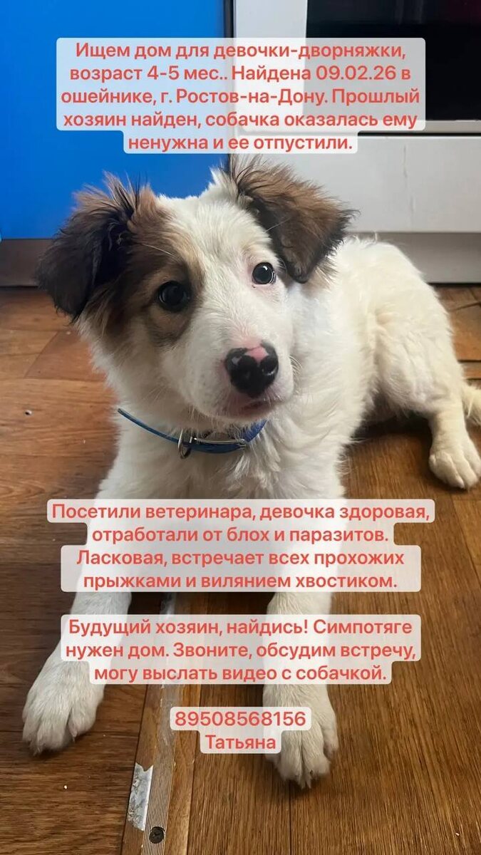 Бросили хозяева❗️ Найдена в г. Ростове-на-Дону на ул. Стальского 09.02 в ошейнике. Собака контактная и охотно искала общения у прохожих. Расклеили объявления о поиске хозяев, с нами связался предыдущий хозяин. Сообщил, что собака жила на стройке, ее кормили, но дальше решили не следить за ней и отпустили. Посетили ветеринара, сдали анализы. Анализы в норме. Отработали от блох и гельминтов. Ветеринар сообщил, что возраст ориентировочно 4-5 мес., вес 9,6 кг. Временно находится у нас в небольшой квартире. За один день научили не гадить, дела справляет на улице. Ищем человека, у которого есть возможность содержать на своем участке без самовыгула. Собака привыкла к людям, игривая и активная. Беспокоимся, что она не выживет одна на улице и продолжит искать своего человека в прохожих. Отдадим в добрые руки с ненавязчивым слежением жизни собаки. Помогите распространить, пожалуйста, объявление! Тел. 89508568156 Телеграмм: @zakharova_t_a