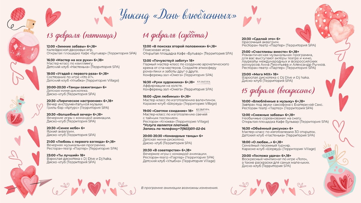 Программа анимации на уикенд "День влюбленных" с 13 по 15 февраля☀️💕