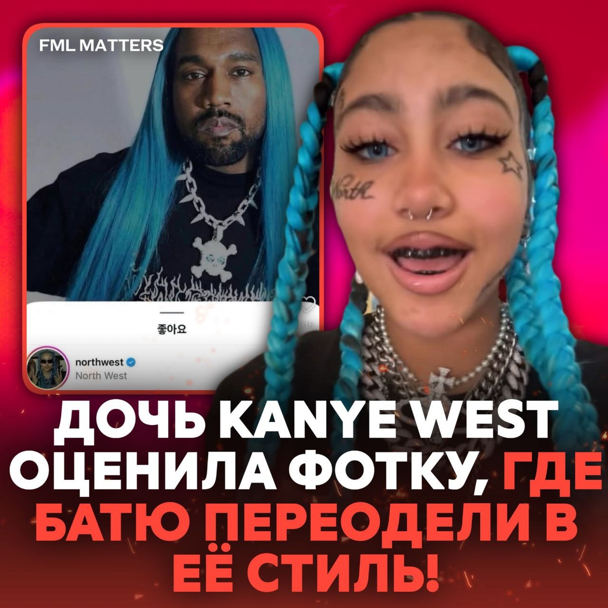 12-летняя Норт оценила пост с нейро-картинкой, где Йе прифотошопили её голубые волосы и превратили в альтушку.