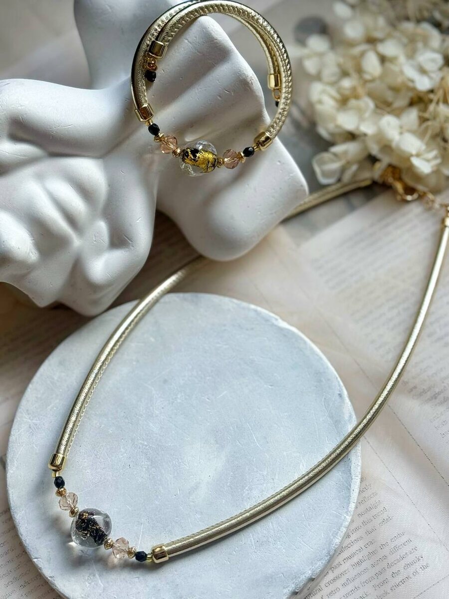 💫 Золотой цвет в украшениях всегда был символом солнечного света, достатка и внутренней энергии. Этот элегантный набор из колье и браслета на золотистом каучуке притягивает взгляд благодаря прозрачным бусинам муранского стекла, внутри которых вручную запечатаны частицы сусального золота. Такое сочетание фактур — гладкого металла и фактурного стекла с мерцающими вкраплениями — создает уникальную игру света, которая добавляет любому наряду роскошный и завершенный вид. Носите этот комплект, когда хотите добавить в свой день немного праздничной атмосферы и почувствовать себя по-настоящему особенной, ведь такие детали говорят о вашем безупречном вкусе лучше любых слов.⚜️ Колье 5445 Браслет 4290 ✨Нажмите для заказа ✉️ Нажмите чтобы задать вопрос