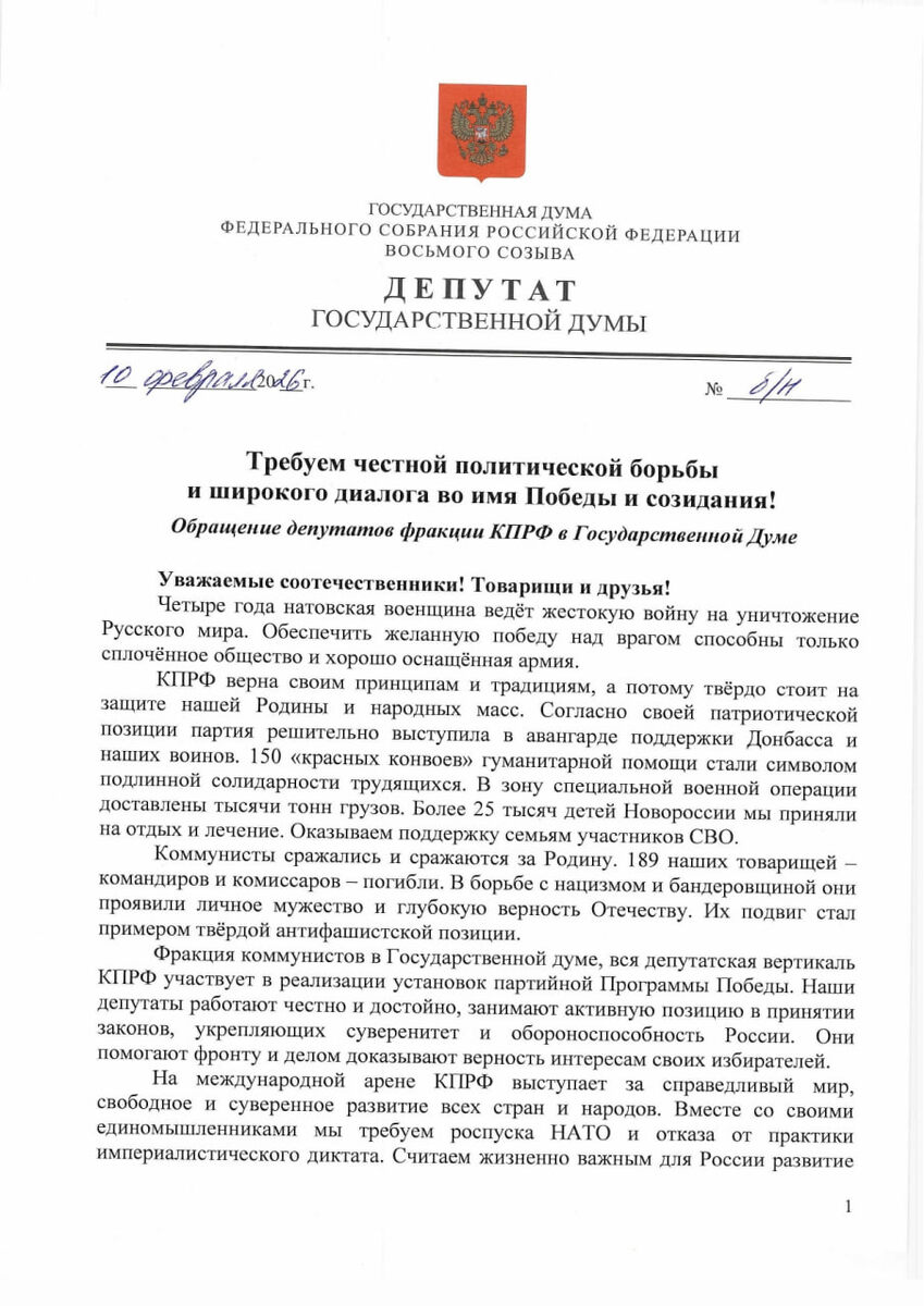 👍Обращение депутатов фракции КПРФ в Государственной Думе