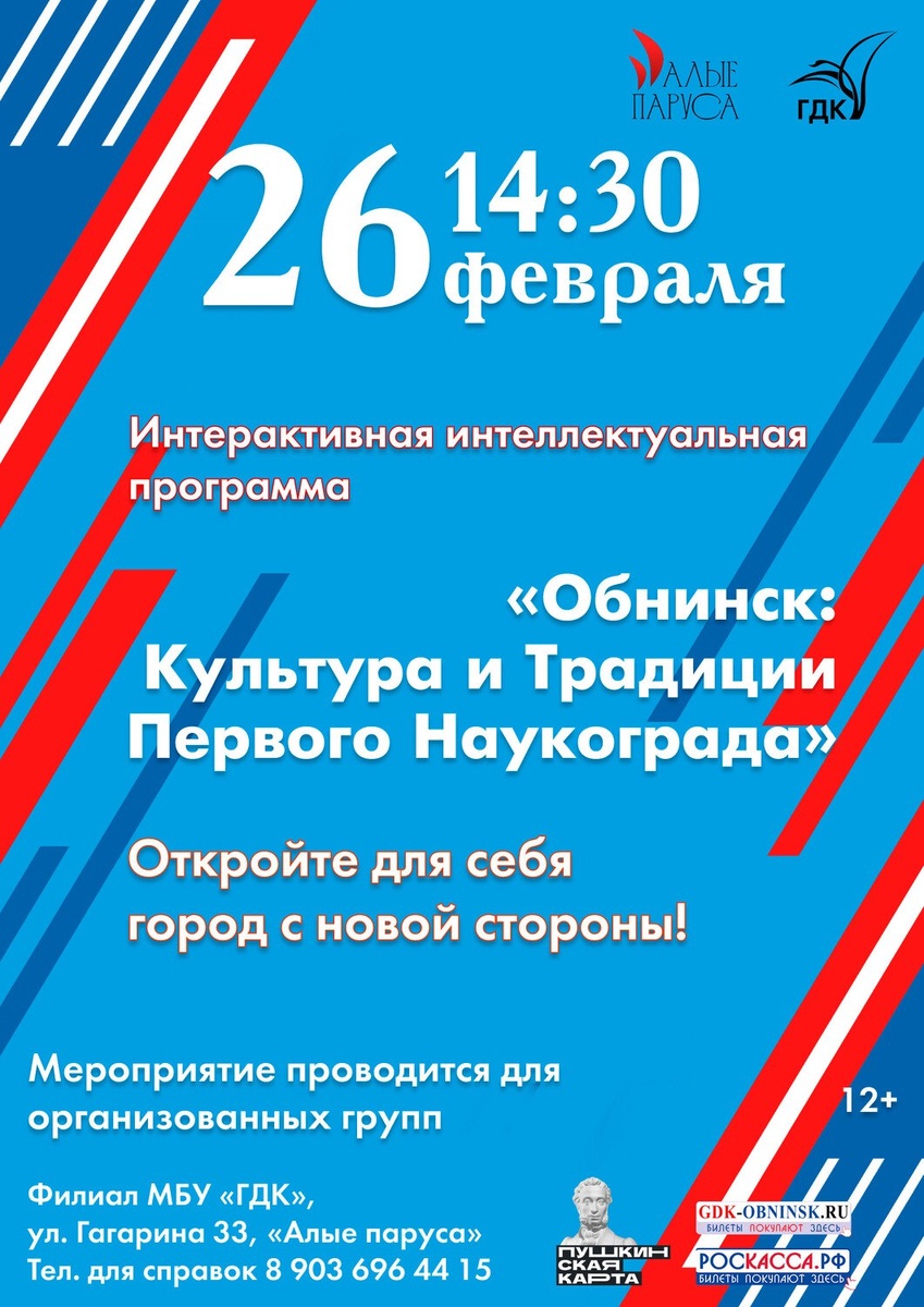 ⚡26 февраля в 14:00 в ДК «Алые паруса» в Обнинске пройдёт культурно-познавательная программа: «Обнинск: культура и традиции Первого