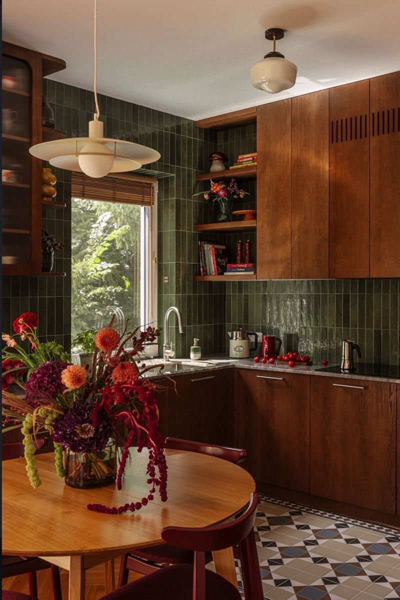 Полевые цветы, пионы, гортензии в вазах. Зелень — больше растений, свежие травы на кухне (базилик, мята в горшках).
