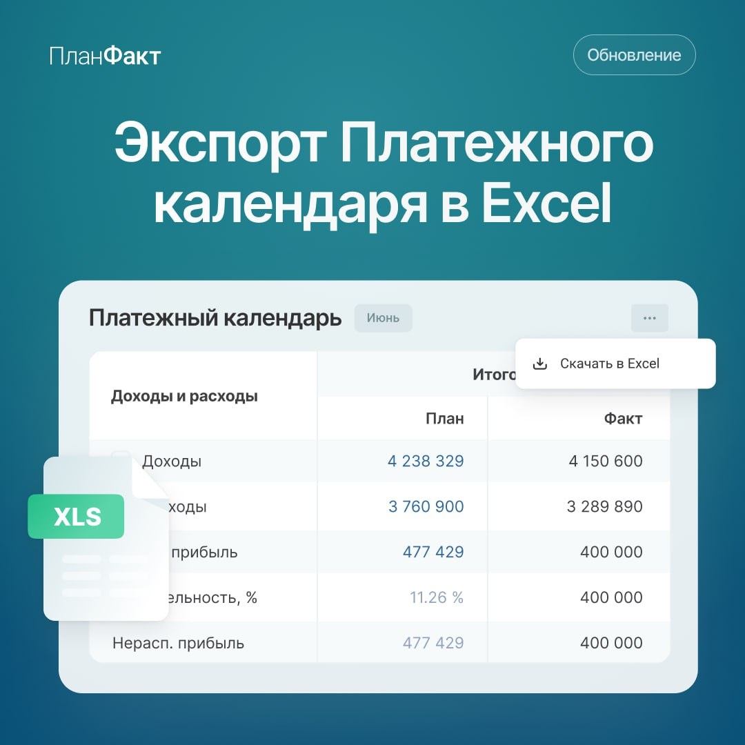 Экспорт Платежного календаря в Excel В отчете Платежный календарь теперь можно выгрузить текущий вид отчета в Excel — со всеми выбранными фильтрами, правами доступа и структурой данных. Вы получаете готовый Excel-файл, полностью совпадающий с данными в ПланФакте, и можете использовать его для согласований и расчетов — без ручного переноса и дублирования таблиц. Чем полезно *️⃣ Один источник данных — больше не нужно вести параллельные Excel-таблицы. *️⃣ Экономия времени — выгрузка в один клик вместо ручного копирования. *️⃣ Удобство согласований — файл легко отправить руководству, бухгалтерии или партнерам. Экспорт превращает Платежный календарь из экранного отчета в полноценный управленческий документ. Важно: в файл попадают только те данные, к которым у вас есть доступ в системе. Права доступа автоматически учитываются при формировании выгрузки. ✔️ Попробовать ПланФакт