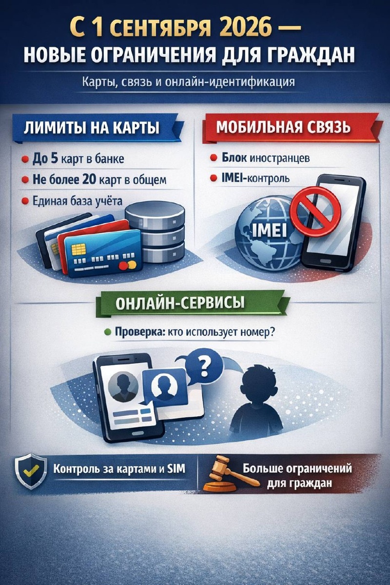 Планируются масштабные поправки в сфере банковских карт, мобильной связи и онлайн-идентификации. Разбираем главное. 💳 Лимиты на банковские карты • Не более 5 карт в одном банке • С 1 сентября 2027 года — не более 20 карт во всех банках • Все данные будут вноситься в новую систему — Единую систему учета платежных карт • ЦБ РФ сможет устанавливать иные лимиты 📱 Мобильная связь • Входящие звонки с иностранных номеров будут блокироваться по умолчанию • Операторы обязаны передавать сведения о пользователях 14–18 лет в спецсистем • С 2027 года в договорах потребуется указывать IMEI вашего телефона • Создается единая база IMEI. С 2028 года оператор сможет отказать в обслуживании устройств, «привязанных» к другим лицам 🌐 Онлайн-сервисы При идентификации по мобильному номеру сервисы должны будут проверять, не используется ли номер ребенком. 📌 Итог: усиливается контроль за оборотом карт, SIM-карт и цифровых идентификаторов. Бизнесу — готовиться к дополнительной комплаенс-нагрузке. Г